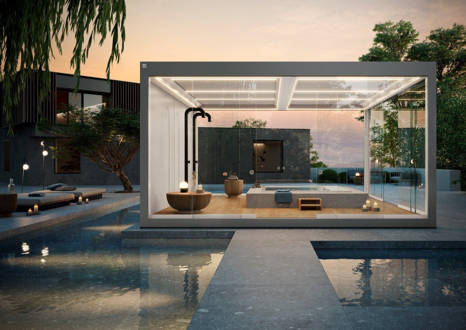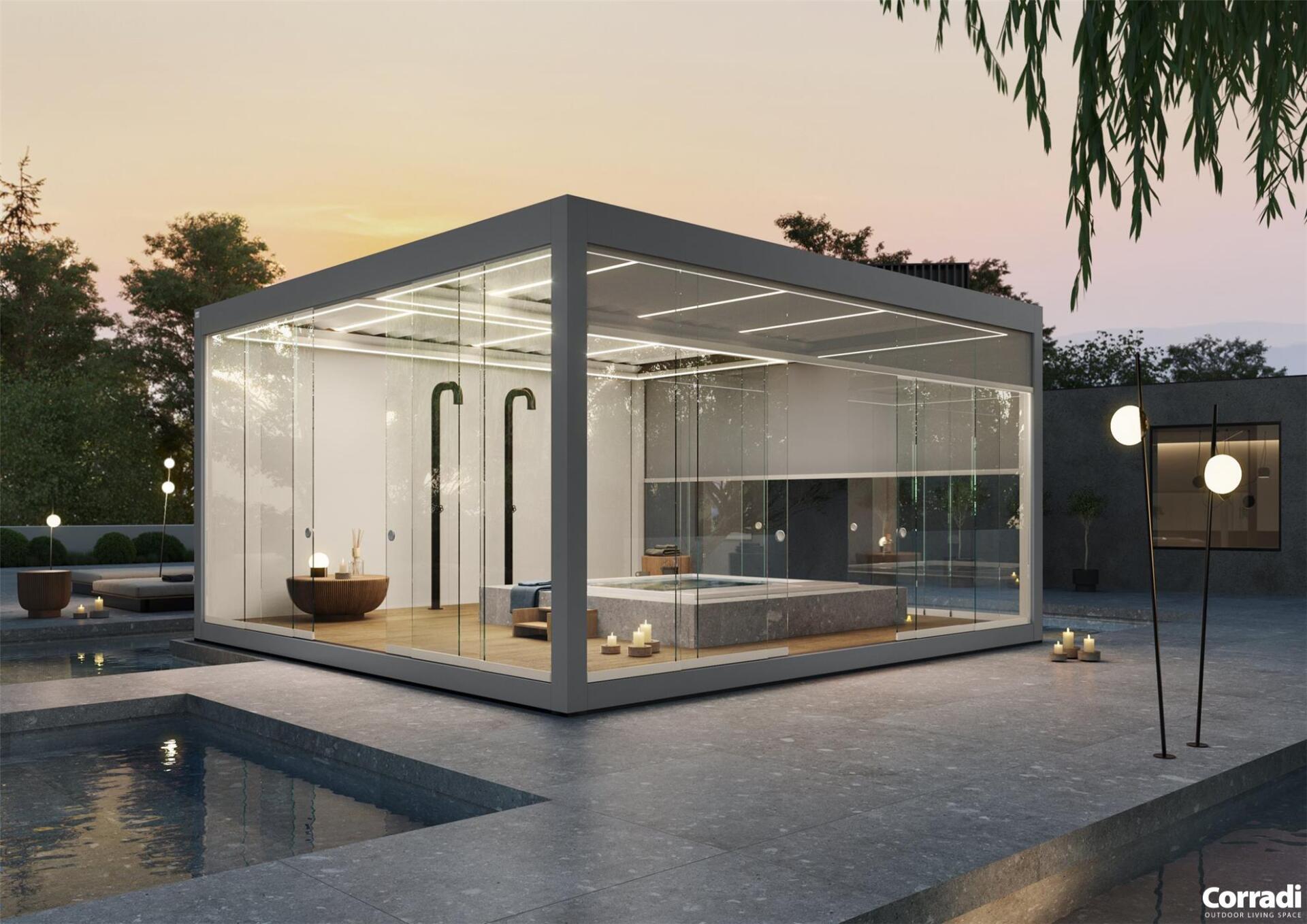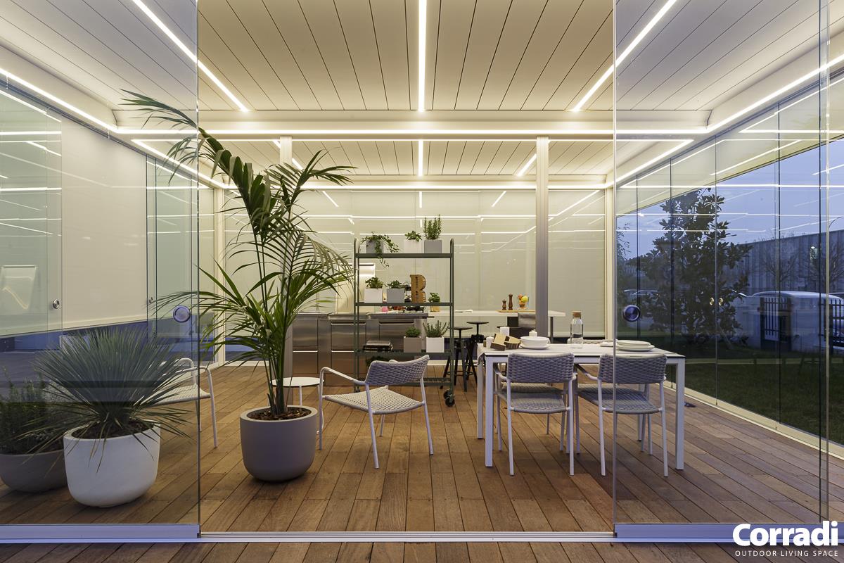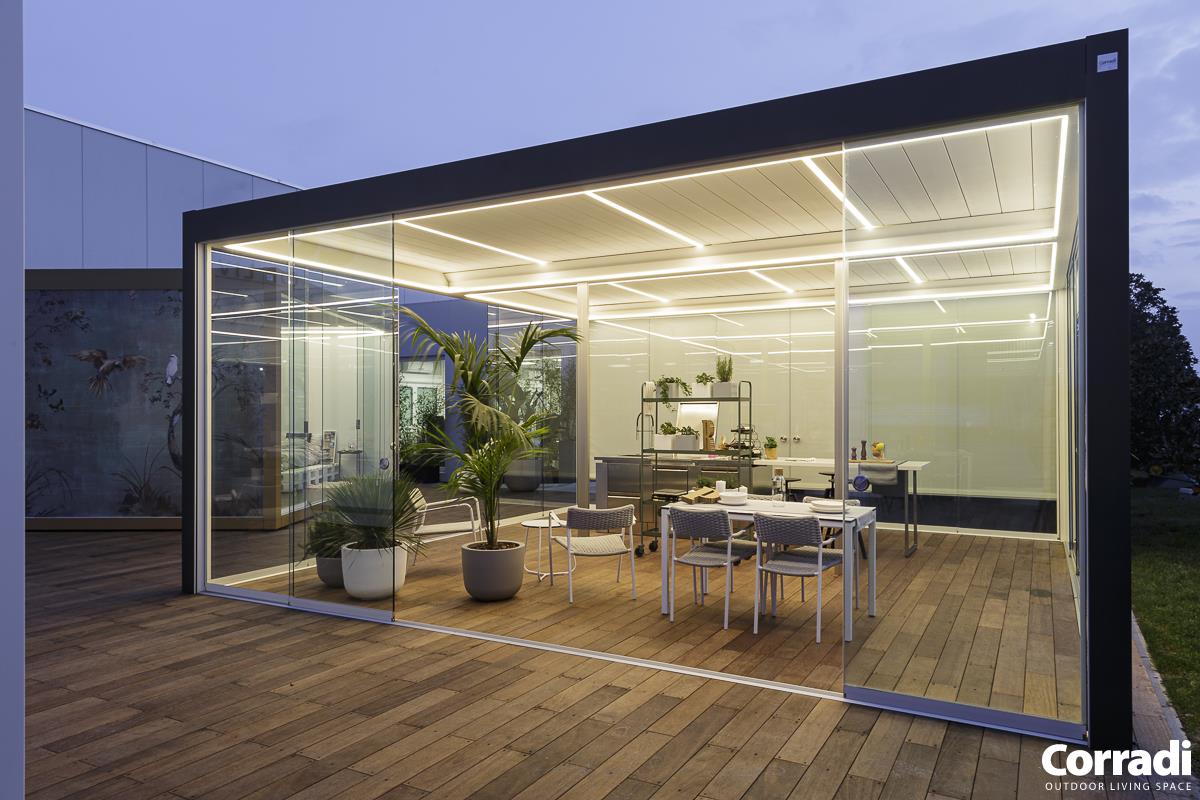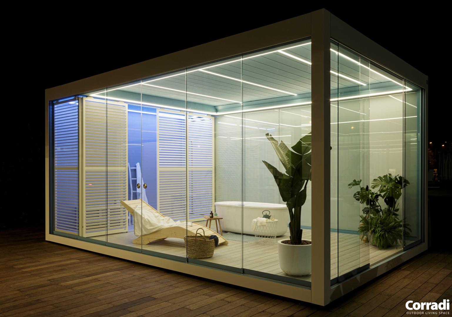 IMAGO è un progetto innovativo ultimo nato in casa Corradi concepito con uno sguardo dello spazio esterno rispetto a ciò che si può immaginare di fare. E’ l’interpretazione dell’outdoor inteso come spazio dell’abitare fuori dalla casa,. Imago supera il concetto di prodotto outdoor, per entrare nella dimensione dello spazio. Una soluzione a lamelle orientabili fino a 135°, autosufficiente per dettagli costruttivi: pedana, pilastri, travi in piena continuità architettonica tra loro.